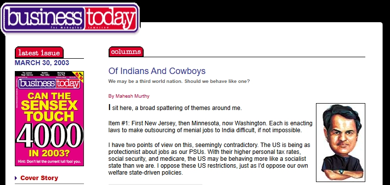 Item #2: The budget slaps an 8 per cent service tax on BPO operations, I read. Unless Nasscom re-classification and lobbying changes that, it may be another pressure point on BPO's downward spiral: Spectramind barely made 60 per cent of its last quarter estimate, and other large BPO operations are running at 25 per cent of capacity. Like the wasted investments in dotcoms, our VCs have put over $100 million in BPOs. This too will go down the drain, and I have a bitter-sweet feeling about it.